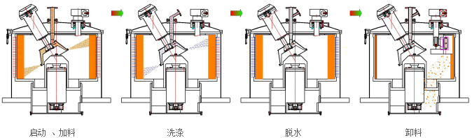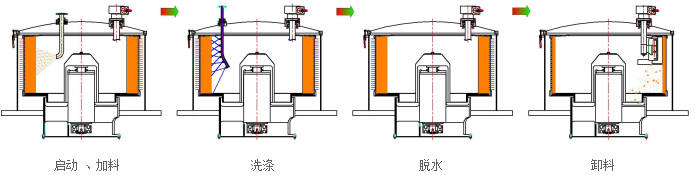 電機(jī)帶動皮帶輪驅(qū)動轉(zhuǎn)鼓繞自身軸線高速回轉(zhuǎn),物料在預(yù)先編制的程序控制下,通過進(jìn)料系統(tǒng)進(jìn)入高速旋轉(zhuǎn)的轉(zhuǎn)鼓內(nèi)。在離心力的作用下,物料均布在過濾介質(zhì)上進(jìn)行脫液分離,液相透過固相物料和濾網(wǎng)縫隙,經(jīng)鼓壁孔甩至機(jī)殼空間,從出液口排出機(jī)外,固相物料截留在轉(zhuǎn)鼓內(nèi)形成濾餅。料層檢測裝置實(shí)時檢測物料的充填位置,當(dāng)濾餅達(dá)到事先設(shè)定的位置時,自動關(guān)閉加料閥,停止進(jìn)料,然后對濾餅進(jìn)行洗滌、脫水,待達(dá)到要求后,離心機(jī)降到卸料速度,刮料器在液(氣)動控制下將濾餅刮下,經(jīng)轉(zhuǎn)鼓底上的出料口卸出。