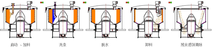 電機(jī)帶動(dòng)皮帶輪驅(qū)動(dòng)轉(zhuǎn)鼓繞自身軸線高速回轉(zhuǎn),物料在預(yù)先編制的程序控制下,通過進(jìn)料系統(tǒng)進(jìn)入高速旋轉(zhuǎn)的轉(zhuǎn)鼓內(nèi)。在離心力的作用下,物料均布在過濾介質(zhì)上進(jìn)行脫液分離,液相透過固相物料和濾網(wǎng)縫隙,經(jīng)鼓壁孔甩至機(jī)殼空間,從出液口排出機(jī)外,固相物料截留在轉(zhuǎn)鼓內(nèi)形成濾餅。料層檢測(cè)裝置實(shí)時(shí)檢測(cè)物料的充填位置,當(dāng)濾餅達(dá)到事先設(shè)定的位置時(shí),自動(dòng)關(guān)閉加料閥,停止進(jìn)料,然后對(duì)濾餅進(jìn)行洗滌、脫水,待達(dá)到要求后,離心機(jī)降到卸料速度,刮料器在液(氣)動(dòng)控制下將濾餅刮下,經(jīng)轉(zhuǎn)鼓底上的出料口卸出。離心機(jī)繼續(xù)降速,氣動(dòng)拉袋裝置上下快速往復(fù)運(yùn)動(dòng),將殘余濾餅抖落,實(shí)現(xiàn)濾餅的完全清除。